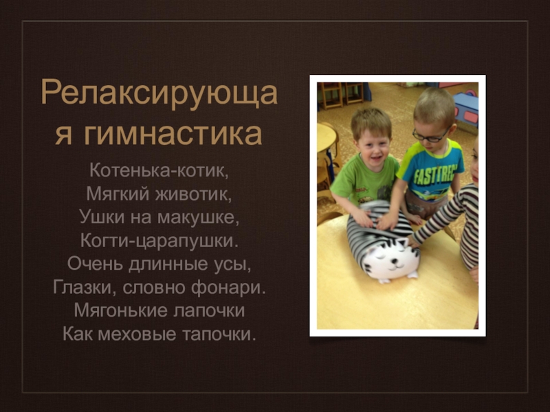 Релаксирующая гимнастикаКотенька-котик,Мягкий животик,Ушки на макушке,Когти-царапушки.Очень длинные усы,Глазки, словно фонари.Мягонькие лапочкиКак меховые тапочки.