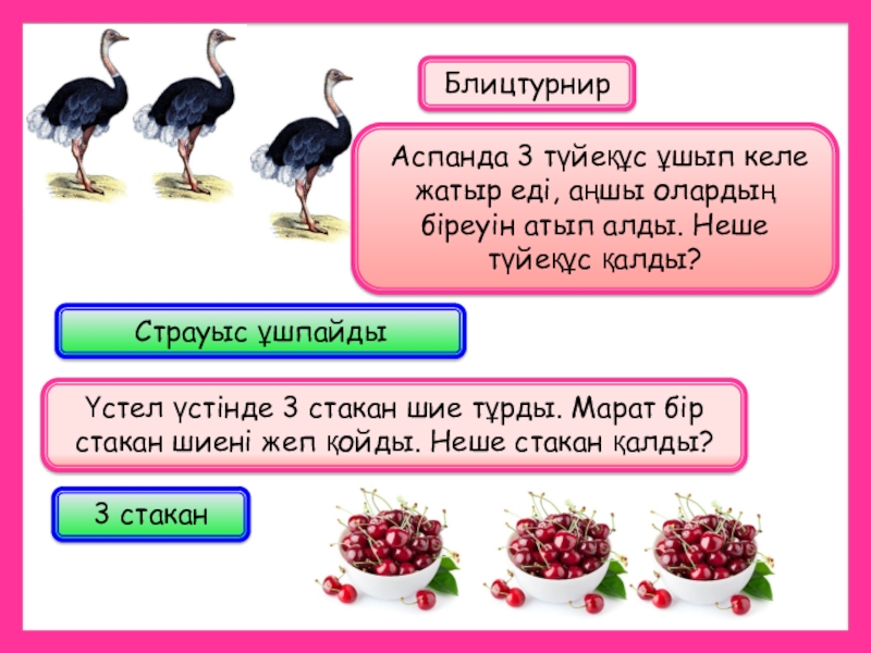 Аспанда 3 түйеқұс ұшып келе жатыр еді, аңшы олардың біреуін атып алды. Неше түйеқұс қалды?