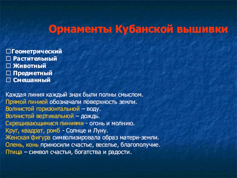 Орнаменты Кубанской вышивки   Геометрический  Растительный 