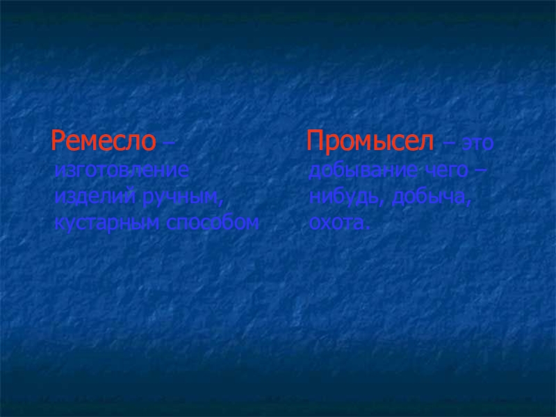 Ремесло – изготовление изделий ручным, кустарным способом Промысел – это добывание чего – нибудь, добыча, охота.