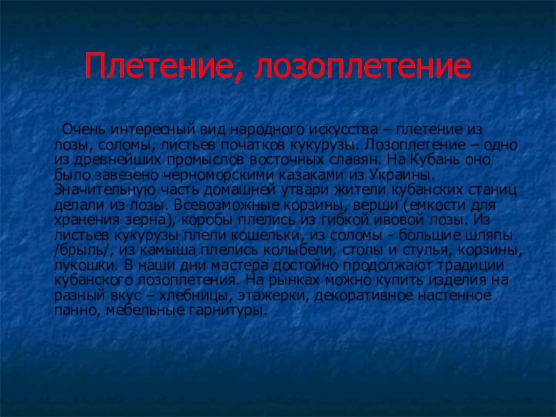 из лозы, соломы, листьев початков кукурузы. Лозоплетение – одно из древнейших промыслов восточных славян. На Кубань оно было завезено черноморскими казаками из Украины. Значительную часть домашней утвари жители кубанских станиц делали из лозы. Всевозможные корзины, верши (емкости для хранения зерна), коробы плелись из гибкой ивовой лозы. Из листьев кукурузы плели кошельки, из соломы - большие шляпы /брыль/, из камыша плелись колыбели, столы и стулья, корзины, лукошки. В наши дни мастера достойно продолжают традиции кубанского лозоплетения. На рынках можно купить изделия на разный вкус – хлебницы, этажерки, декоративное настенное панно, мебельные гарнитуры.