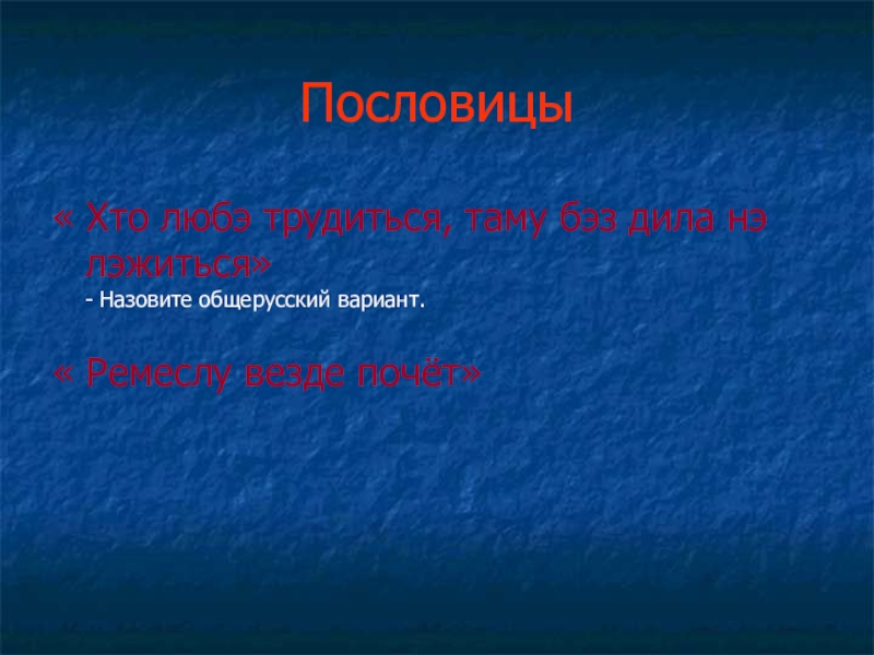 Пословицы« Хто любэ трудиться, таму бэз дила нэ лэжиться» - Назовите общерусский вариант. « Ремеслу везде почёт»