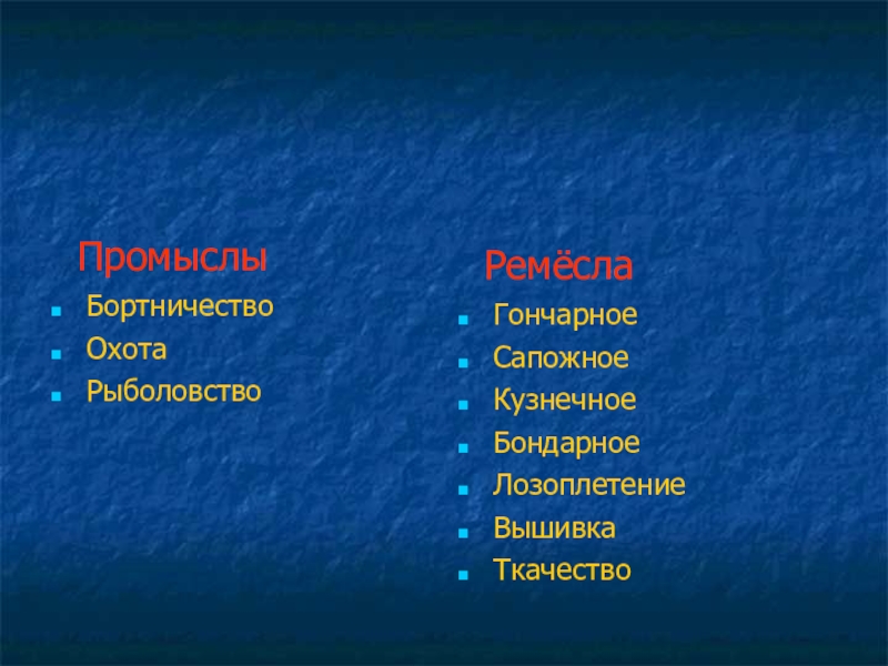 ПромыслыБортничествоОхотаРыболовство РемёслаГончарноеСапожноеКузнечноеБондарноеЛозоплетениеВышивкаТкачество