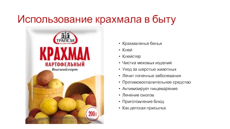 Использование крахмала в бытуКрахмаленье бельяКлейКлейстерЧистка меховых изделийУход за шерстью животныхЛечит почечные заболеванияПротивовоспалительное средствоАктивизирует пищеварениеЛечение ожоговПриготовление блюдКак детская