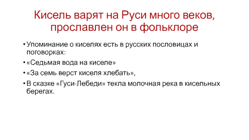 Кисель варят на Руси много веков, прославлен он в фольклореУпоминание о киселях есть в русских пословицах и