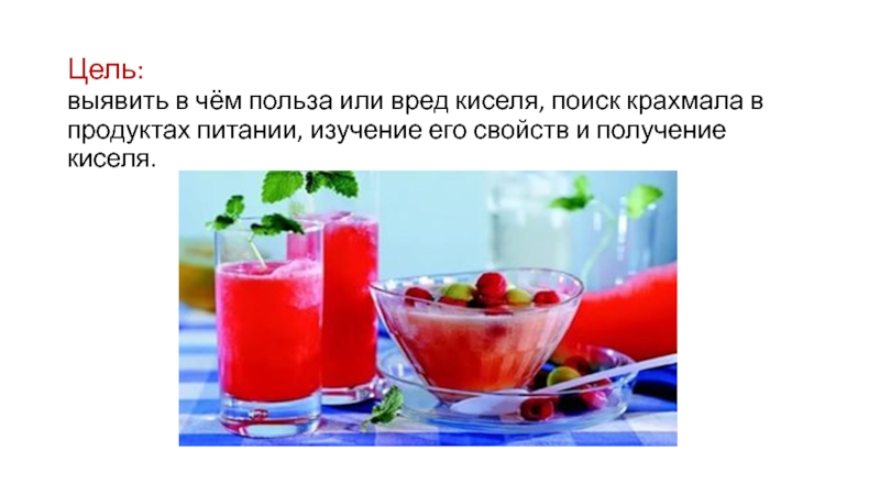 Слайд 7Цель: выявить в чём польза или вред киселя, поиск крахмала в