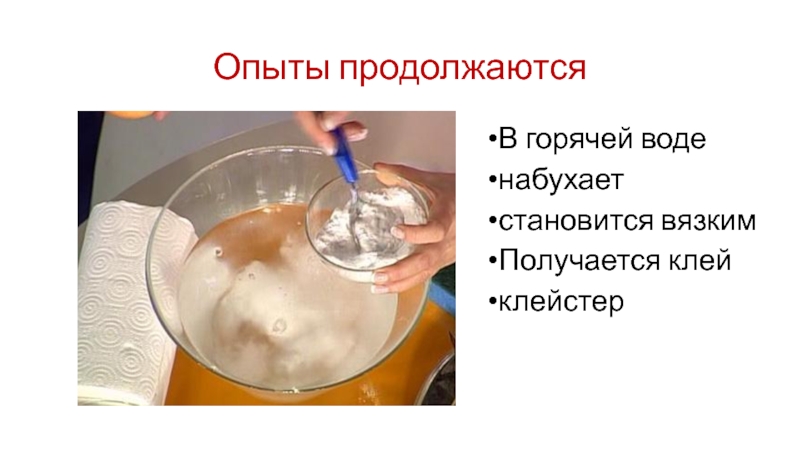 Опыты продолжаютсяВ горячей воденабухаетстановится вязкимПолучается клейклейстер