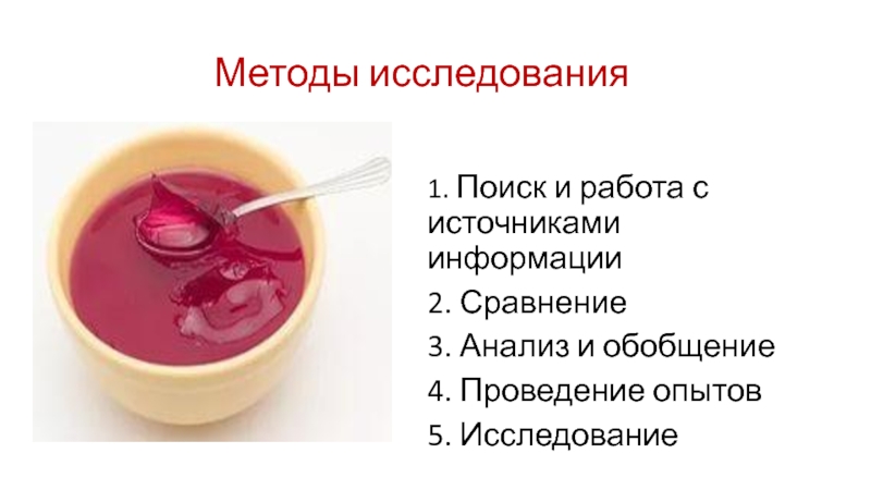 Методы исследования1. Поиск и работа с источниками информации2. Сравнение3. Анализ и обобщение4. Проведение опытов5. Исследование
