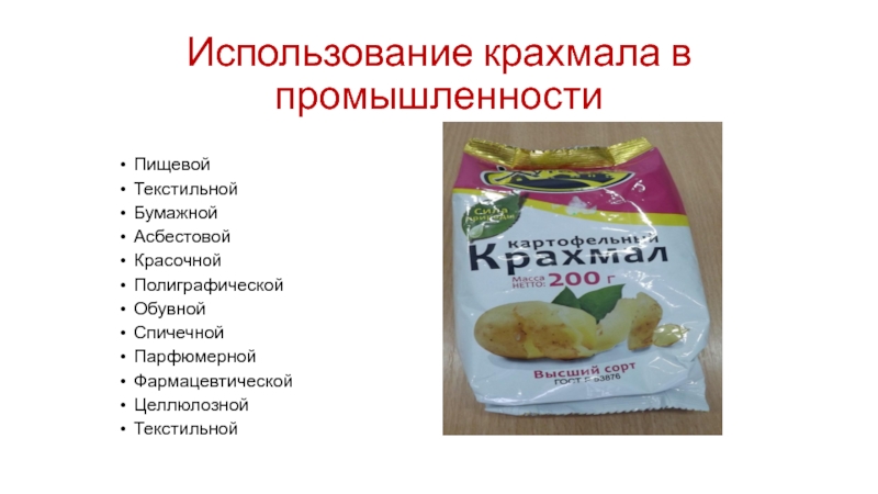 Использование крахмала в промышленностиПищевой ТекстильнойБумажнойАсбестовойКрасочнойПолиграфической ОбувнойСпичечнойПарфюмернойФармацевтическойЦеллюлозной Текстильной
