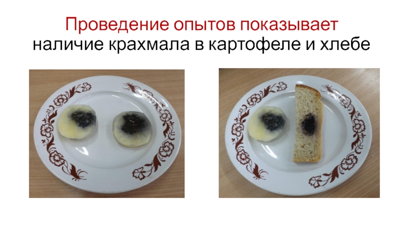 Слайд 15Проведение опытов показывает наличие крахмала в картофеле и хлебе
