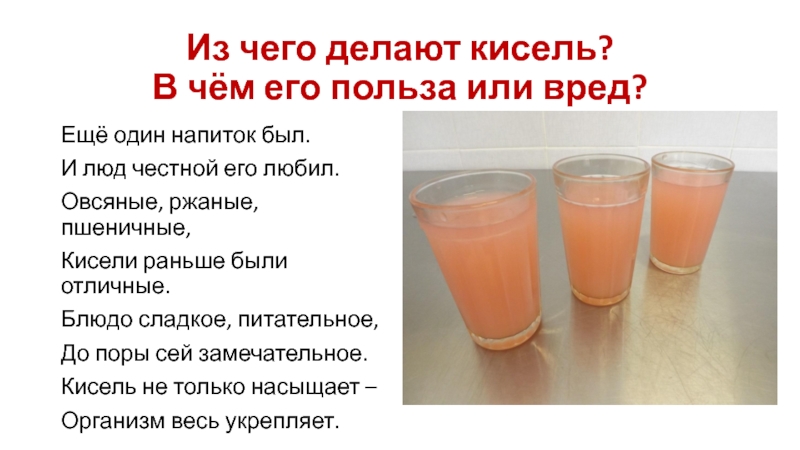 Слайд 6Из чего делают кисель? В чём его польза или вред?
