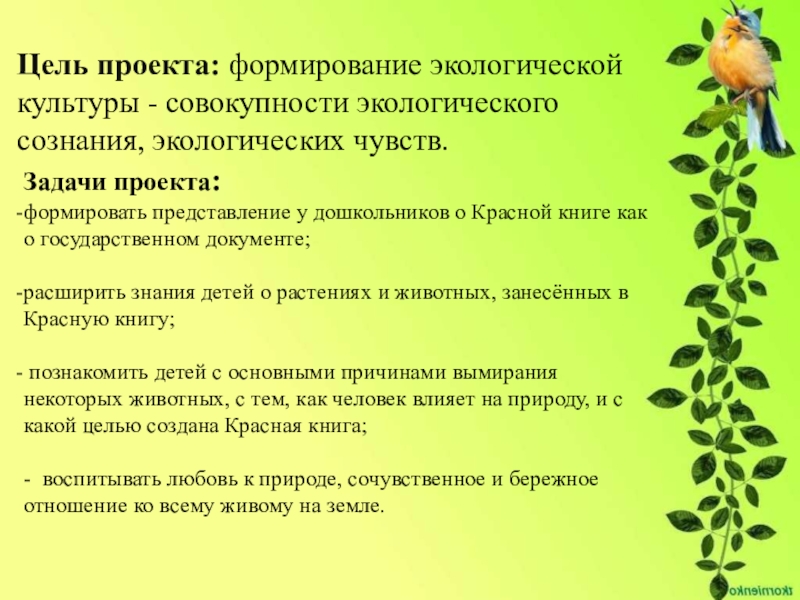 Цель проекта: формирование экологической культуры - совокупности экологического сознания, экологических чувств.