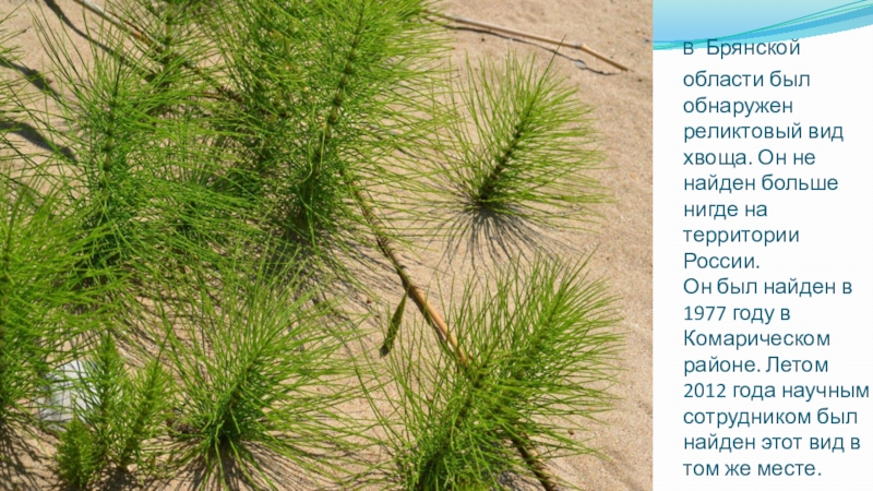 Слайд 5В Брянской области был обнаружен реликтовый вид хвоща. Он не найден