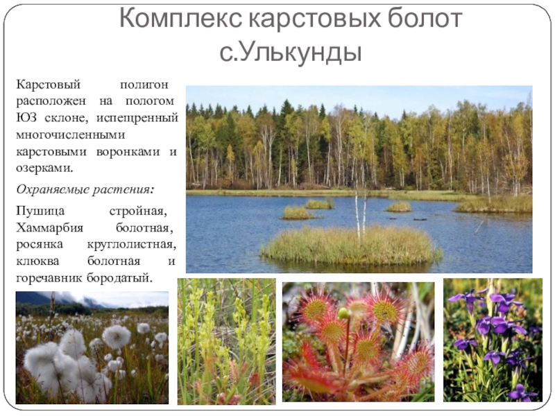 Пушица стройная, Хаммарбия болотная, росянка круглолистная, клюква болотная и горечавник бородатый.