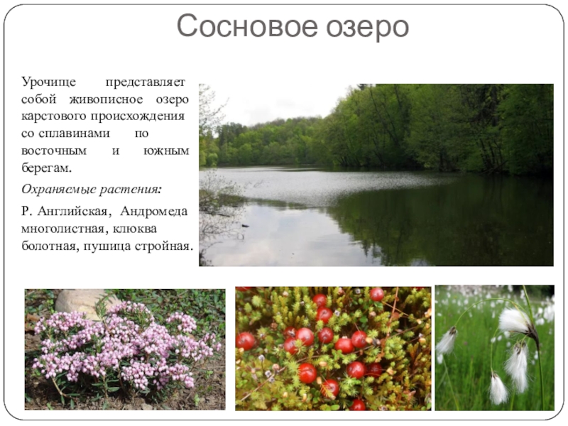 Урочище представляет собой живописное озеро карстового происхождения со сплавинами по