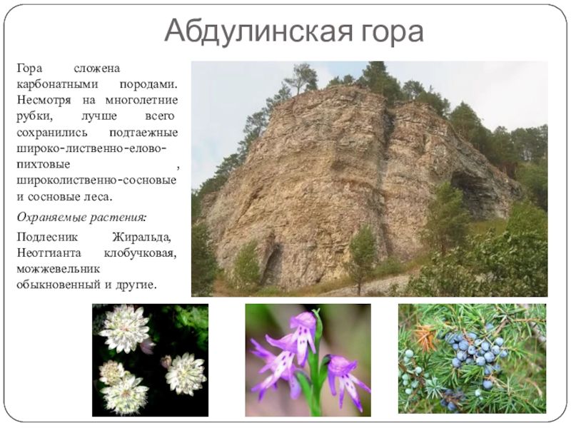 Гора сложена карбонатными породами. Несмотря на многолетние рубки, лучше всего