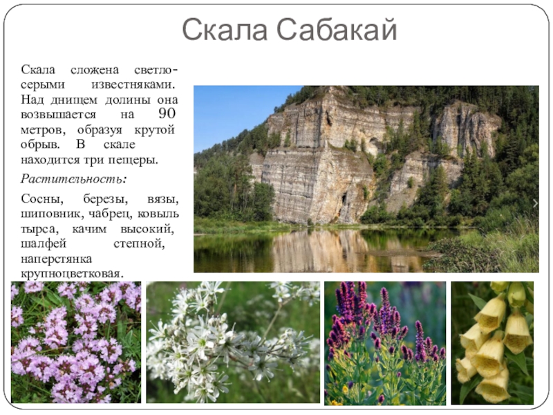 90 метров, образуя крутой обрыв. В скале находится три пещеры.