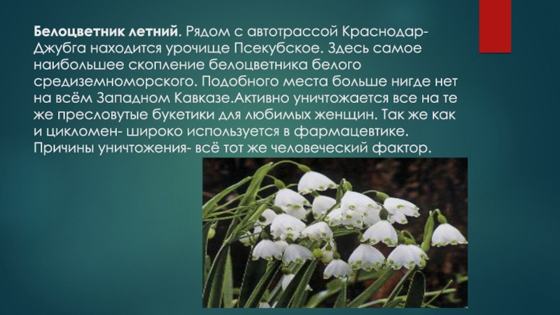 Слайд 10Белоцветник летний. Рядом с автотрассой Краснодар-Джубга находится урочище Псекубское. Здесь самое