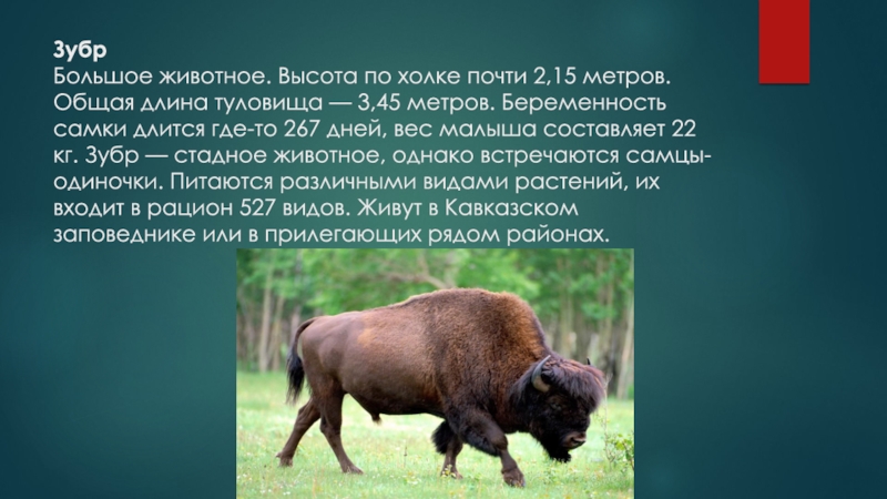 — 3,45 метров. Беременность самки длится где-то 267 дней, вес малыша составляет 22 кг. Зубр — стадное животное, однако встречаются самцы-одиночки. Питаются различными видами растений, их входит в рацион 527 видов. Живут в Кавказском заповеднике или в прилегающих рядом районах.