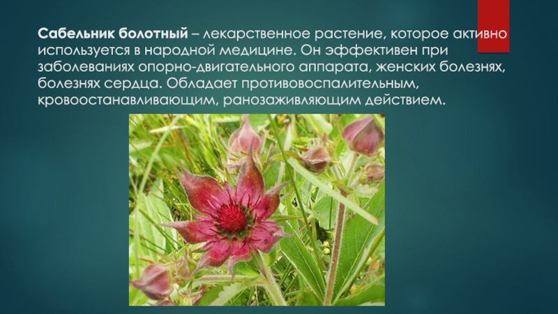 Слайд 13Сабельник болотный – лекарственное растение, которое активно используется в народной медицине.
