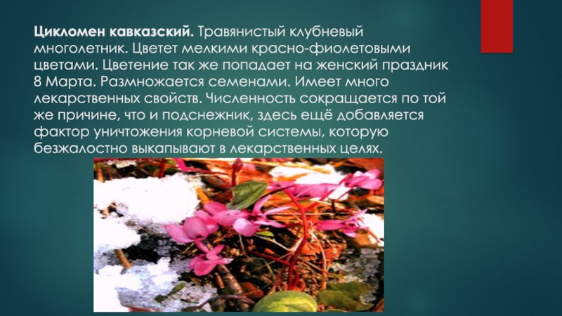 Слайд 9Цикломен кавказский. Травянистый клубневый многолетник. Цветет мелкими красно-фиолетовыми цветами. Цветение так