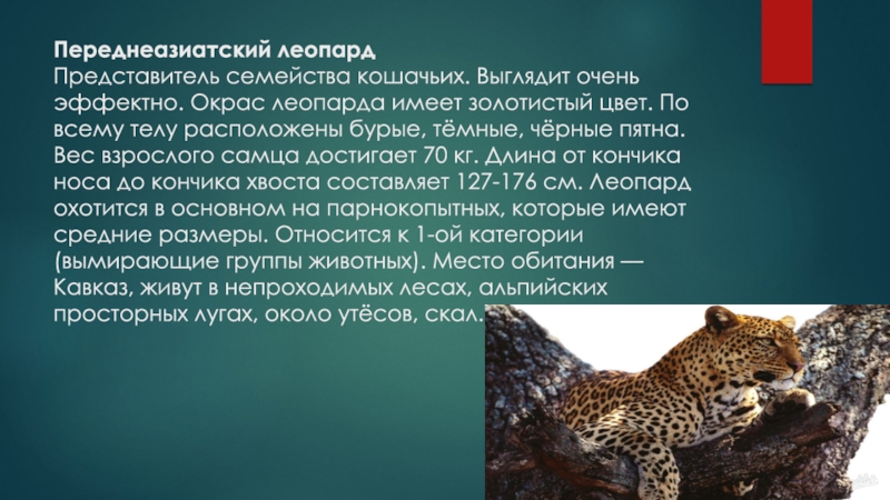 цвет. По всему телу расположены бурые, тёмные, чёрные пятна. Вес взрослого самца достигает 70 кг. Длина от кончика носа до кончика хвоста составляет 127-176 см. Леопард охотится в основном на парнокопытных, которые имеют средние размеры. Относится к 1-ой категории (вымирающие группы животных). Место обитания — Кавказ, живут в непроходимых лесах, альпийских просторных лугах, около утёсов, скал.