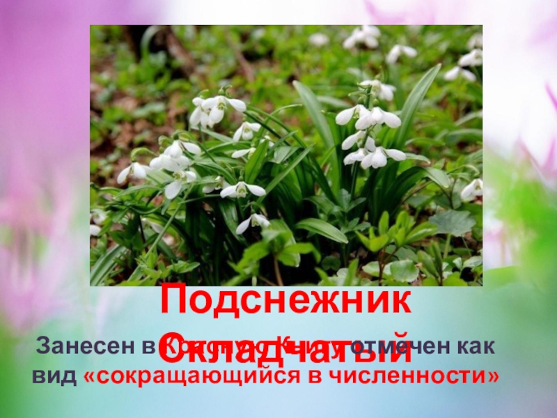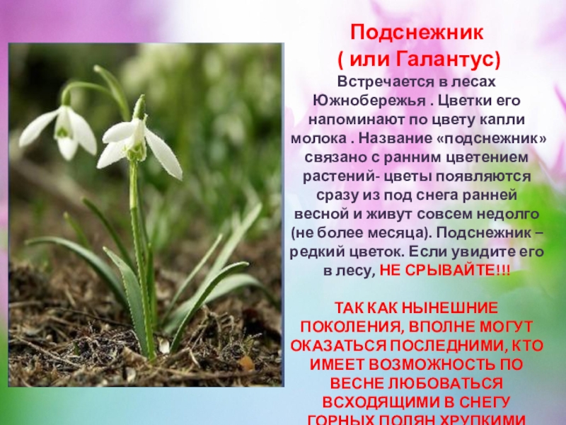 напоминают по цвету капли молока . Название «подснежник» связано с ранним цветением растений- цветы появляются сразу из под снега ранней весной и живут совсем недолго (не более месяца). Подснежник – редкий цветок. Если увидите его в лесу, НЕ СРЫВАЙТЕ!!!