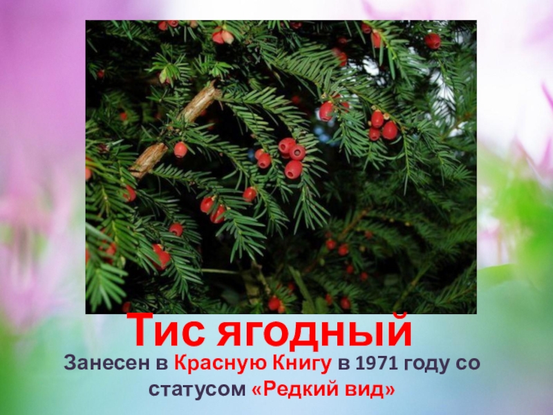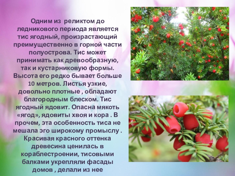 Слайд 4Одним из реликтом до ледникового периода является тис ягодный, произрастающий преимущественно