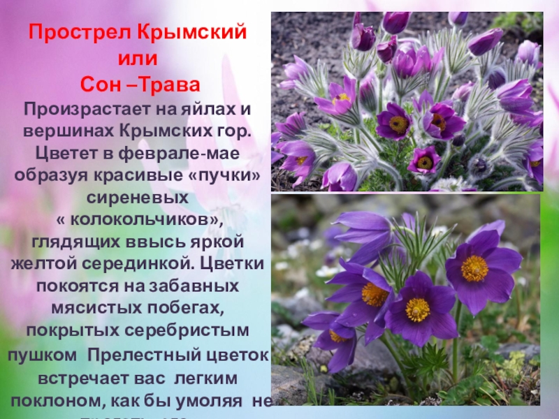 « колокольчиков», глядящих ввысь яркой желтой серединкой. Цветки покоятся на забавных мясистых побегах, покрытых серебристым пушком Прелестный цветок встречает вас легким поклоном, как бы умоляя не трогать его.