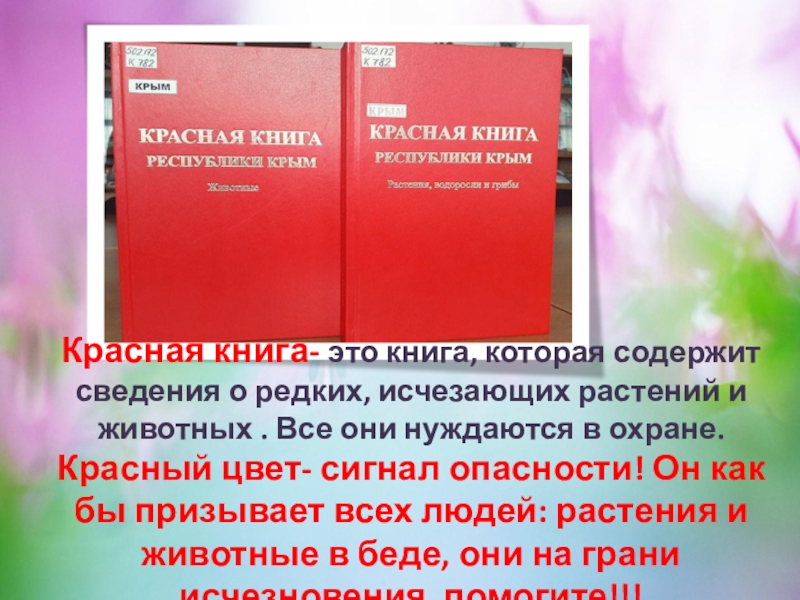 Красный цвет- сигнал опасности! Он как бы призывает всех людей: растения и животные в беде, они на грани исчезновения, помогите!!!