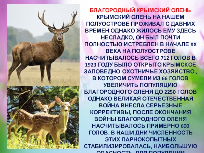 однако жилось ему здесь несладко, он был почти полностью истреблен В начале xx Века на полуострове насчитывалось всего 712 голов В 1923 году было открыто Крымское заповедно-охотничье хозяйство , в котором сумели из 66 голов увеличить популяцию благородного оленя до 2250 голов однако великая отечественная война внесла серьезные коррективы, после окончания войны благородного оленя насчитывалось примерно 600 голов. В наши дни численность этих парнокопытных стабилизировалась, наибольшую опасность для популяции благородного оленя представляют браконьеры и волки