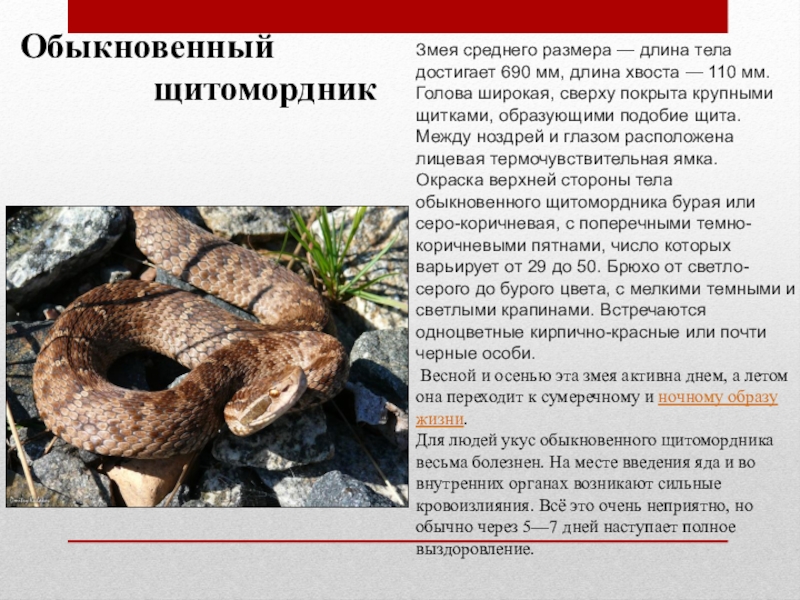Для людей укус обыкновенного щитомордника весьма болезнен. На месте введения яда и во внутренних органах возникают сильные кровоизлияния. Всё это очень неприятно, но обычно через 5—7 дней наступает полное выздоровление.