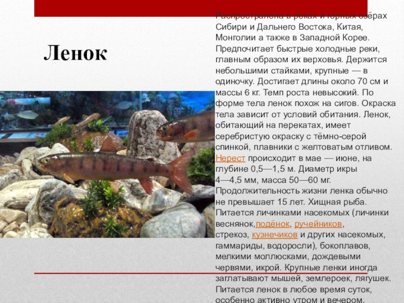 Монголии а также в Западной Корее. Предпочитает быстрые холодные реки, главным образом их верховья. Держится небольшими стайками, крупные — в одиночку. Достигает длины около 70 см и массы 6 кг. Темп роста невысокий. По форме тела ленок похож на сигов. Окраска тела зависит от условий обитания. Ленок, обитающий на перекатах, имеет серебристую окраску с тёмно-серой спинкой, плавники с желтоватым отливом.