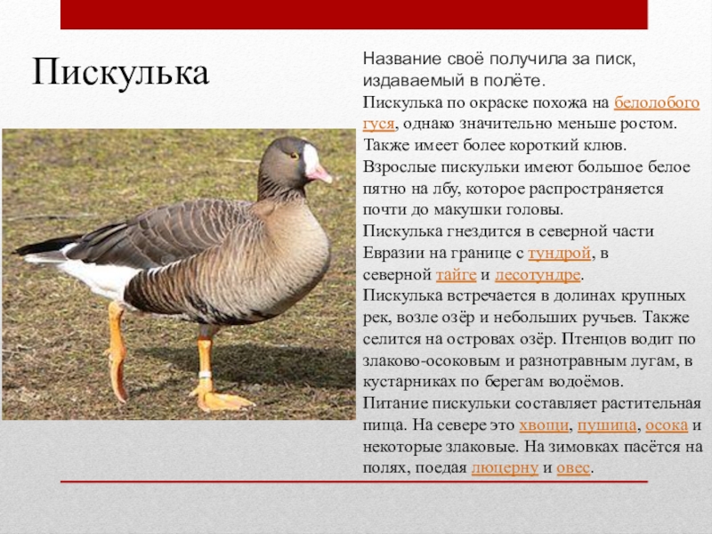 на белолобого гуся, однако значительно меньше ростом. Также имеет более короткий клюв. Взрослые пискульки имеют большое белое пятно на лбу, которое распространяется почти до макушки головы.
