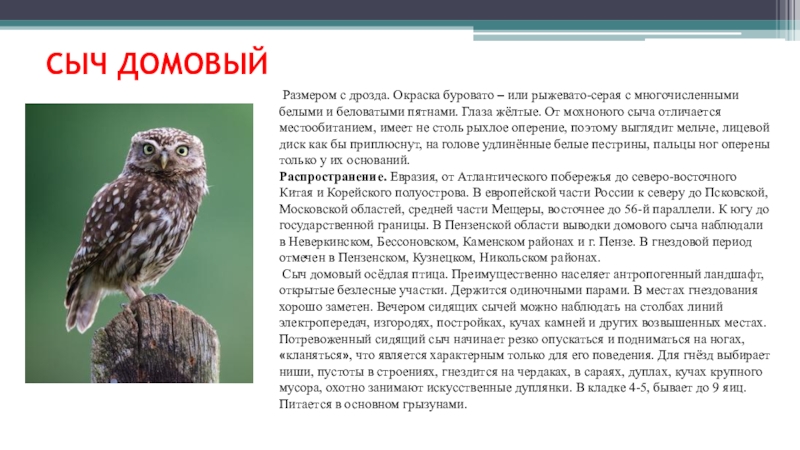 Распространение. Евразия, от Атлантического побережья до северо-восточного Китая и Корейского полуострова. В европейской части России к северу до Псковской, Московской областей, средней части Мещеры, восточнее до 56-й параллели. К югу до государственной границы. В Пензенской области выводки домового сыча наблюдали в Неверкинском, Бессоновском, Каменском районах и г. Пензе. В гнездовой период отмечен в Пензенском, Кузнецком, Никольском районах.