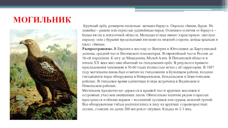 Крупный орёл, размером несколько меньше беркута. Окраска тёмная, бурая. На
