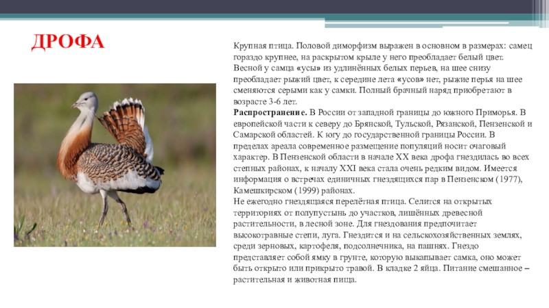 Распространение. В России от западной границы до южного Приморья. В европейской части к северу до Брянской, Тульской, Рязанской, Пензенской и Самарской областей. К югу до государственной границы России. В пределах ареала современное размещение популяций носит очаговый характер. В Пензенской области в начале ХХ века дрофа гнездилась во всех степных районах, к началу ХХI века стала очень редким видом. Имеется информация о встречах единичных гнездящихся пар в Пензенском (1977), Камешкирском (1999) районах.