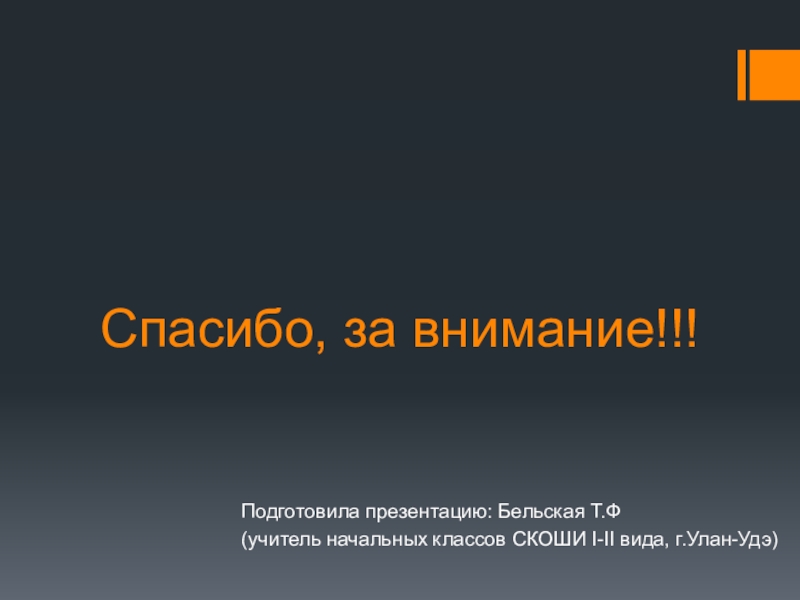 Спасибо, за внимание!!!Подготовила презентацию: Бельская Т.Ф(учитель начальных классов СКОШИ I-II вида, г.Улан-Удэ)