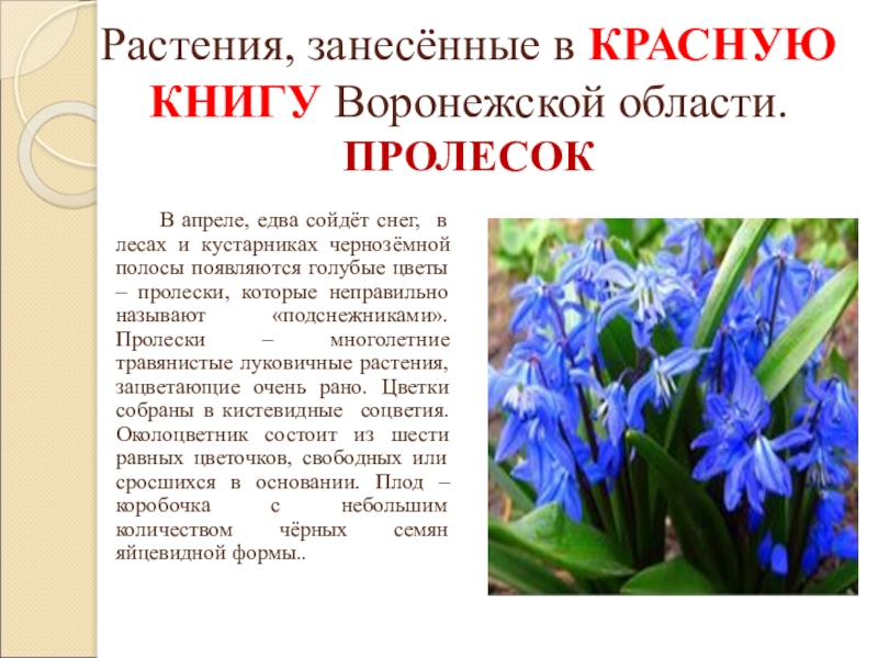 в лесах и кустарниках чернозёмной полосы появляются голубые цветы – пролески, которые неправильно называют «подснежниками». Пролески – многолетние травянистые луковичные растения, зацветающие очень рано. Цветки собраны в кистевидные соцветия. Околоцветник состоит из шести равных цветочков, свободных или сросшихся в основании. Плод – коробочка с небольшим количеством чёрных семян яйцевидной формы..