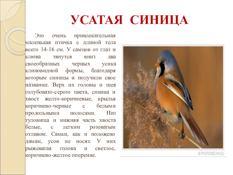 см. У самцов от глаз и клюва тянутся вниз два своеобразных черных усика клиновидной формы, благодаря которым синицы и получили свое название. Верх их головы и шея голубовато-серого цвета, спинка и хвост желто-коричневые, крылья коричнево-черные с белыми продольными полосами. Низ туловища и нижняя часть хвоста белые, с легким розоватым отливом. Самки, как и положено дамам, усов не носят. У них рыжеватая голова и светлое, коричнево-желтое оперение.