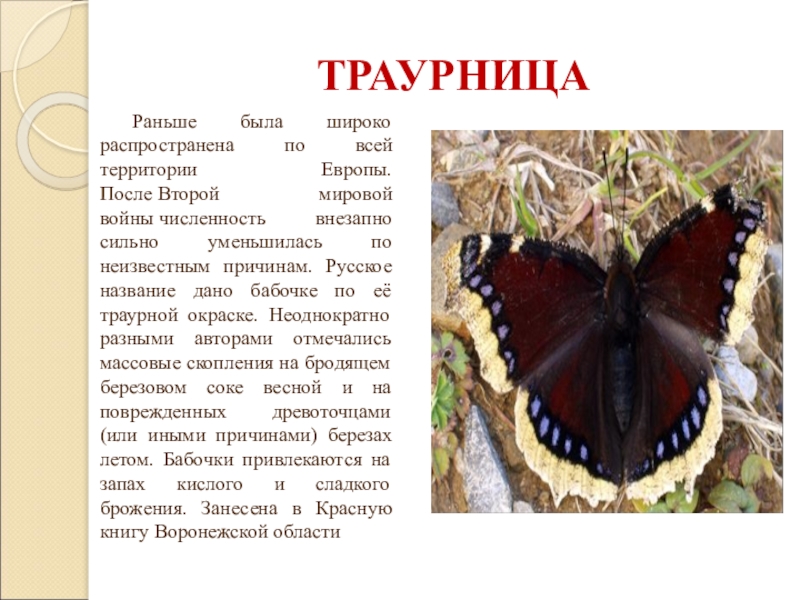 внезапно сильно уменьшилась по неизвестным причинам. Русское название дано бабочке по её траурной окраске. Неоднократно разными авторами отмечались массовые скопления на бродящем березовом соке весной и на поврежденных древоточцами (или иными причинами) березах летом. Бабочки привлекаются на запах кислого и сладкого брожения. Занесена в Красную книгу Воронежской области