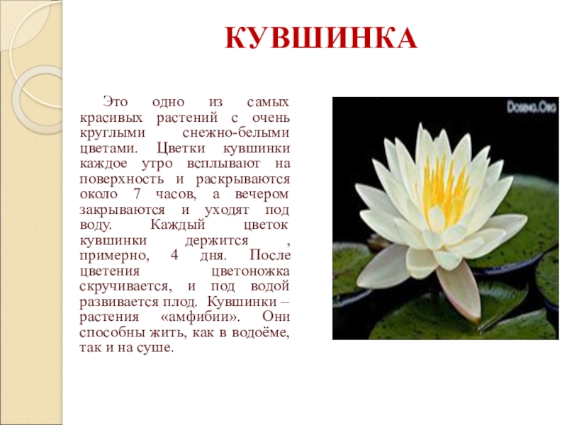 Цветки кувшинки каждое утро всплывают на поверхность и раскрываются около 7 часов, а вечером закрываются и уходят под воду. Каждый цветок кувшинки держится , примерно, 4 дня. После цветения цветоножка скручивается, и под водой развивается плод. Кувшинки – растения «амфибии». Они способны жить, как в водоёме, так и на суше.