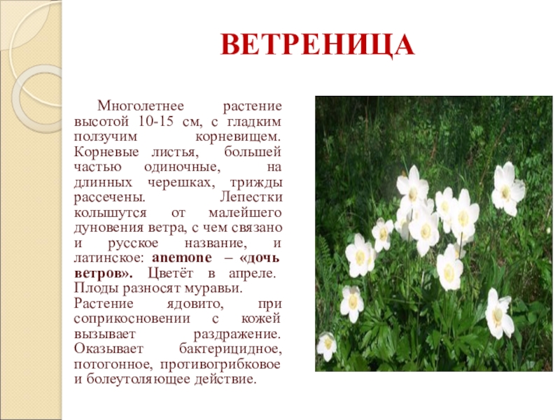 большей частью одиночные, на длинных черешках, трижды рассечены. Лепестки колышутся от малейшего дуновения ветра, с чем связано и русское название, и латинское: anemone – «дочь ветров». Цветёт в апреле. Плоды разносят муравьи. Растение ядовито, при соприкосновении с кожей вызывает раздражение. Оказывает бактерицидное, потогонное, противогрибковое и болеутоляющее действие.