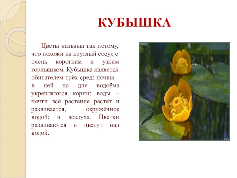 коротким и узким горлышком. Кубышка является обитателем трёх сред: почвы – в ней на дне водоёма укрепляются корни; воды – почти всё растение растёт и развивается, окружённое водой; и воздуха. Цветки развиваются и цветут над водой.