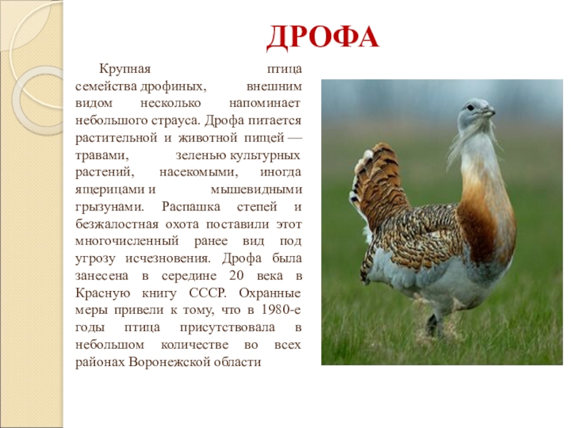 и животной пищей — травами, зеленью культурных растений, насекомыми, иногда ящерицами и мышевидными грызунами. Распашка степей и безжалостная охота поставили этот многочисленный ранее вид под угрозу исчезновения. Дрофа была занесена в середине 20 века в Красную книгу СССР. Охранные меры привели к тому, что в 1980-е годы птица присутствовала в небольшом количестве во всех районах Воронежской области