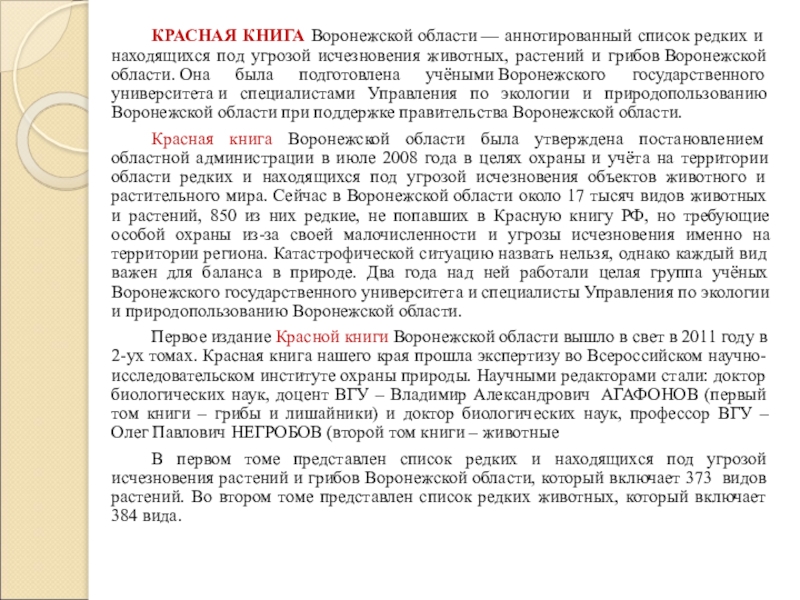 Слайд 2 КРАСНАЯ КНИГА Воронежской области — аннотированный список редких и находящихся под угрозой