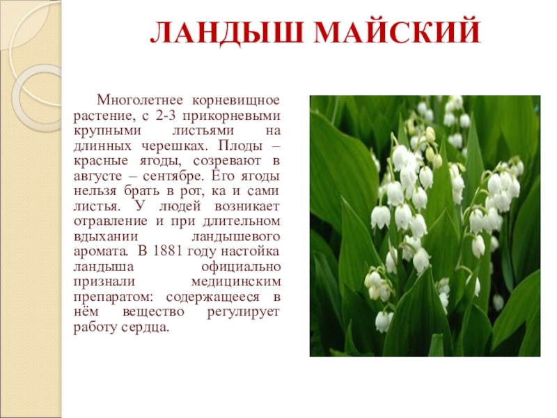 черешках. Плоды – красные ягоды, созревают в августе – сентябре. Его ягоды нельзя брать в рот, ка и сами листья. У людей возникает отравление и при длительном вдыхании ландышевого аромата. В 1881 году настойка ландыша официально признали медицинским препаратом: содержащееся в нём вещество регулирует работу сердца.