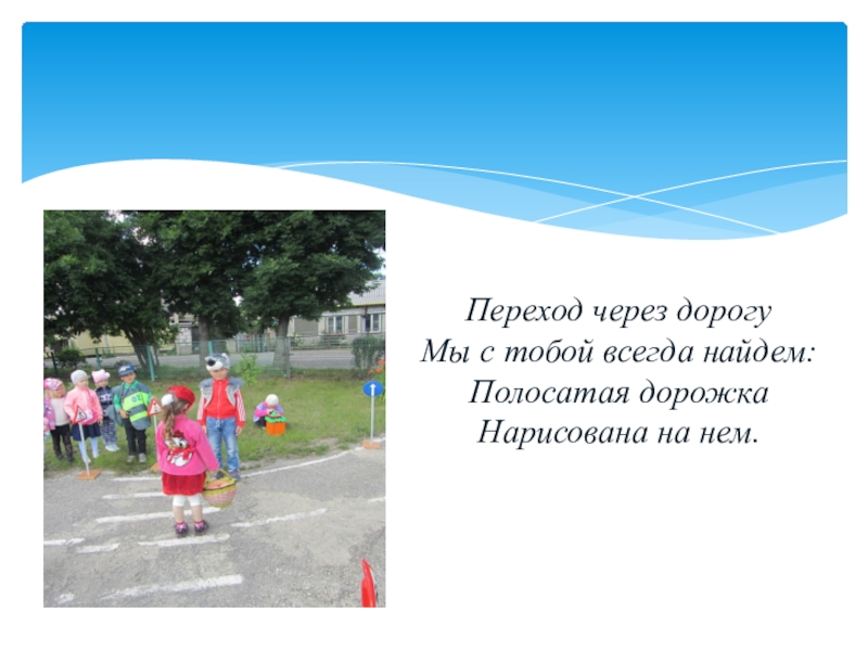 Слайд 8Переход через дорогу Мы с тобой всегда найдем: Полосатая дорожка Нарисована на нем.