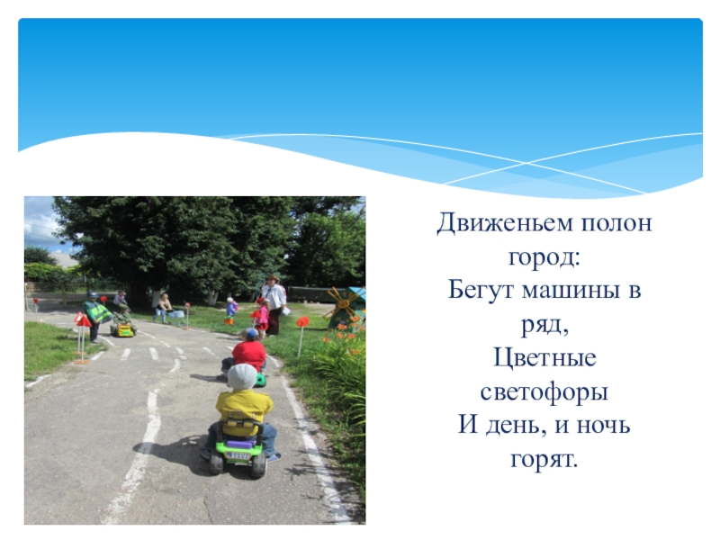 Слайд 5Движеньем полон город: Бегут машины в ряд, Цветные светофоры И день, и ночь горят.