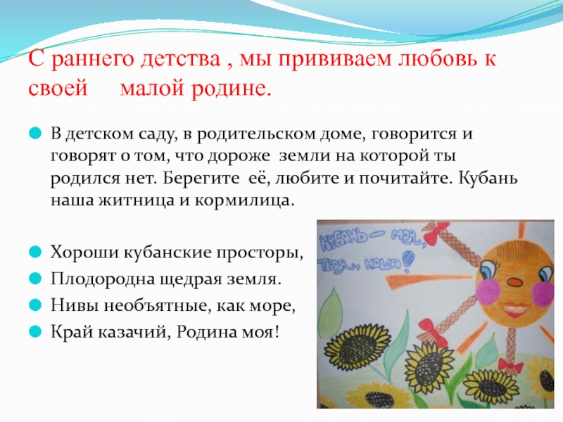 В детском саду, в родительском доме, говорится и говорят о том, что дороже земли на которой ты родился нет. Берегите её, любите и почитайте. Кубань наша житница и кормилица.